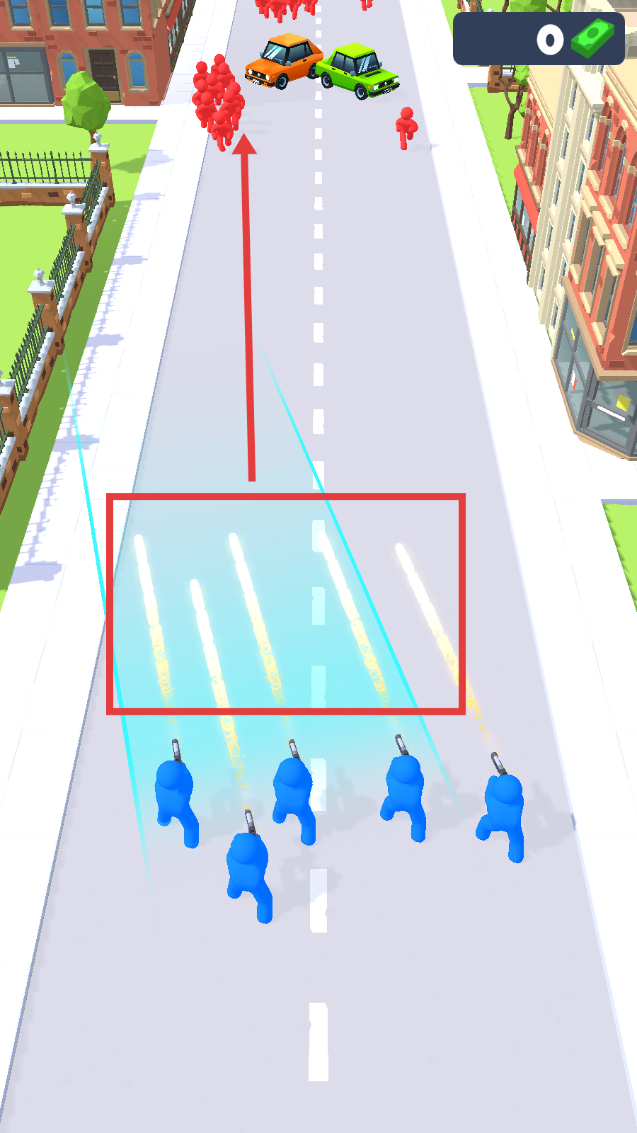 2、控制蓝色小人射击红色敌人群体,优先消灭聚集目标,枪口特效显示攻击有效,同时管理金钱资源显示为【0】需节省使用。