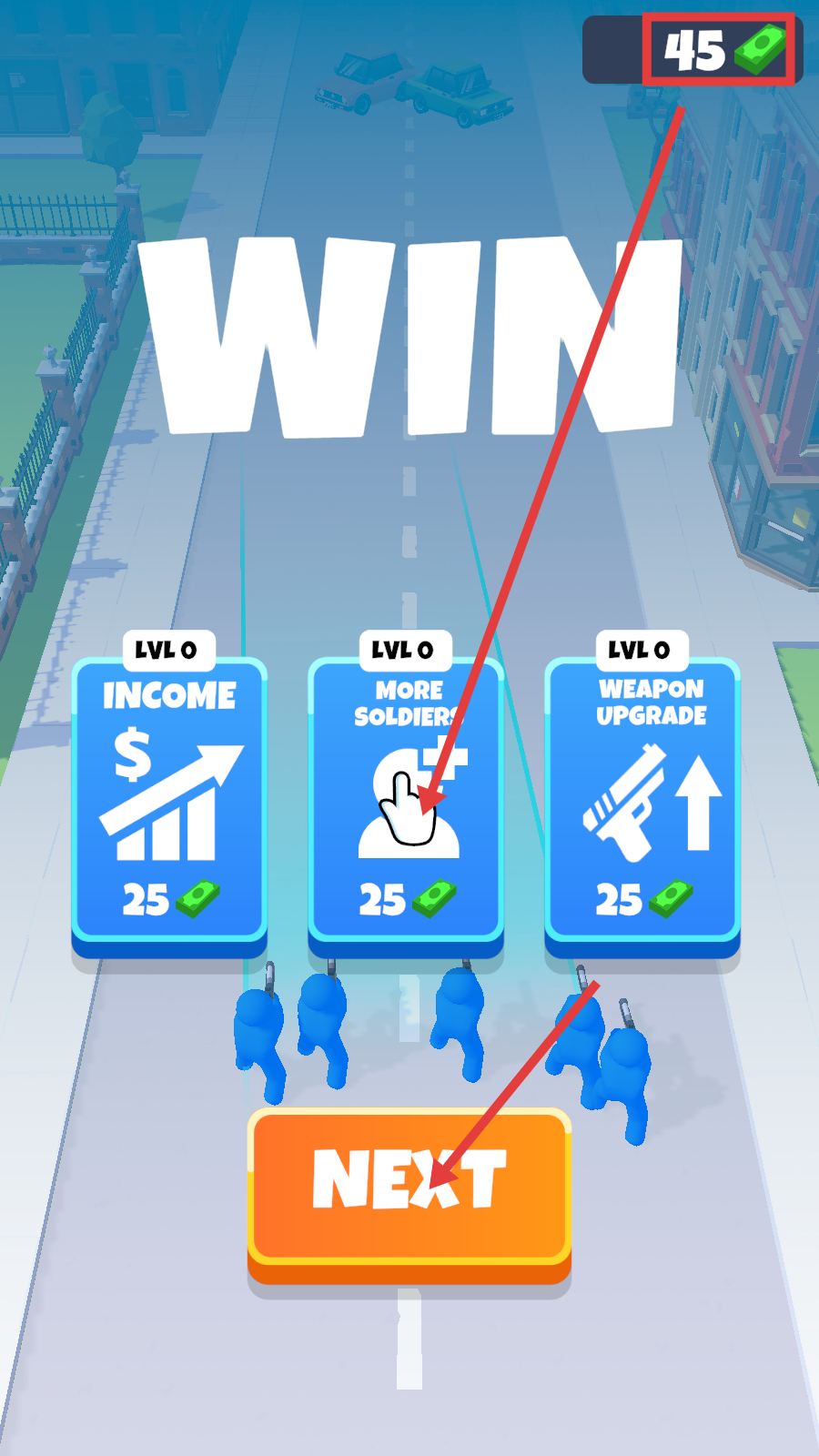 4、胜利后金钱达到【25】选择升级选项,然后点击【NEXT】继续关卡。