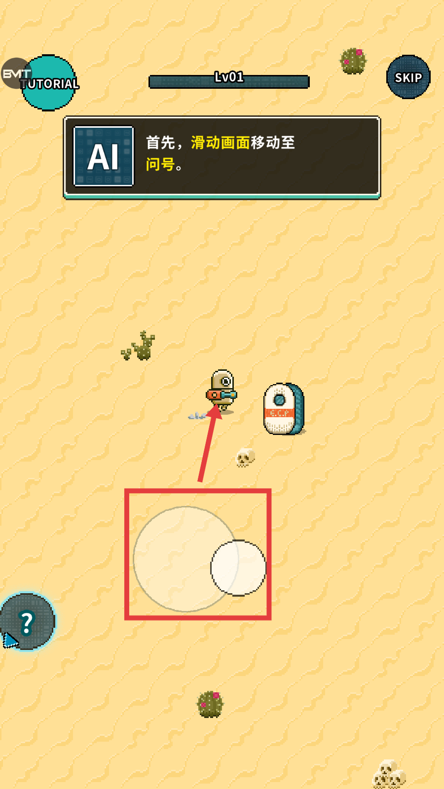 1、首先滑动画面移动角色至问号处,开启游戏相关指引或内容。