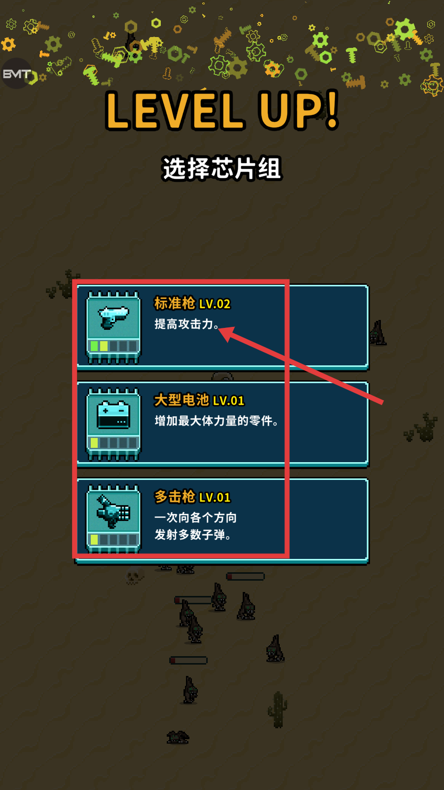 3、角色升级时,可选择合适的芯片组,像“标准枪LV.02”能提高攻击力,助力战斗。