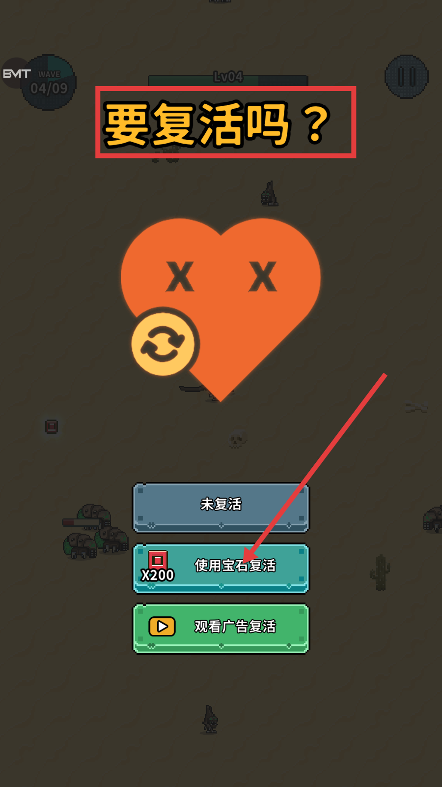 4、若角色战败,可选择使用宝石或观看广告复活,继续参与游戏。