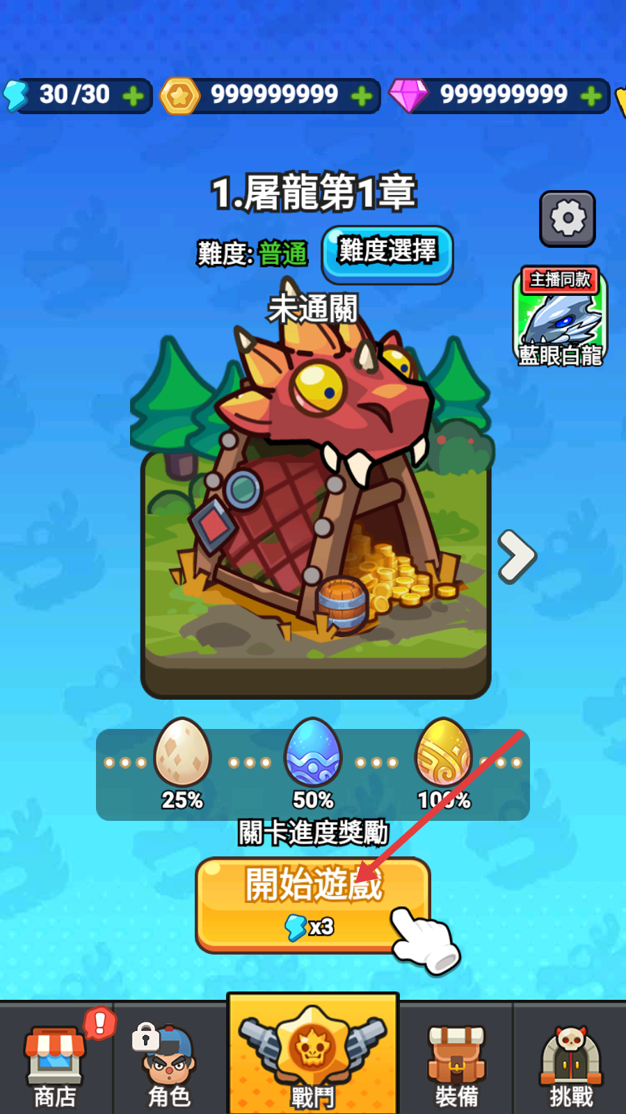 1、点击【開始遊戲】,进入“屠龙第1章”关卡,开启与巨龙的战斗。