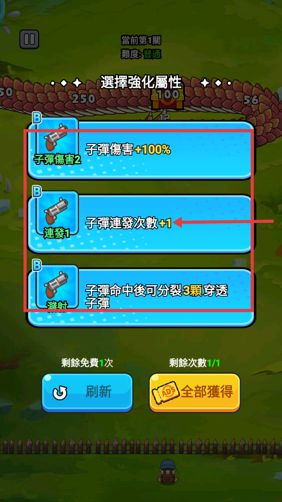 3、在属性强化界面,可选择“子弹伤害+100%”“子弹連發次數+1”等强化属性,提升战斗能力。