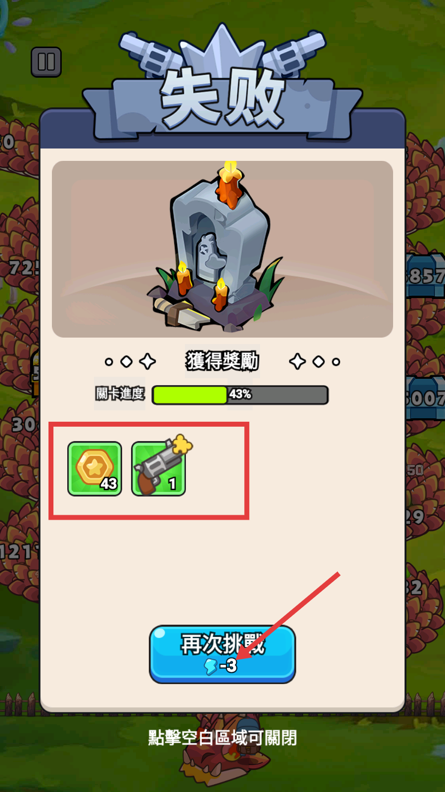 4、若挑战失败,可获得金币、武器等奖励,点击【再次挑戰】,继续参与关卡挑战。