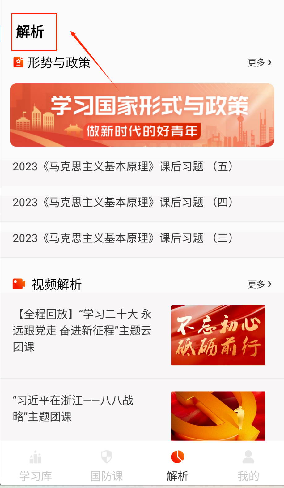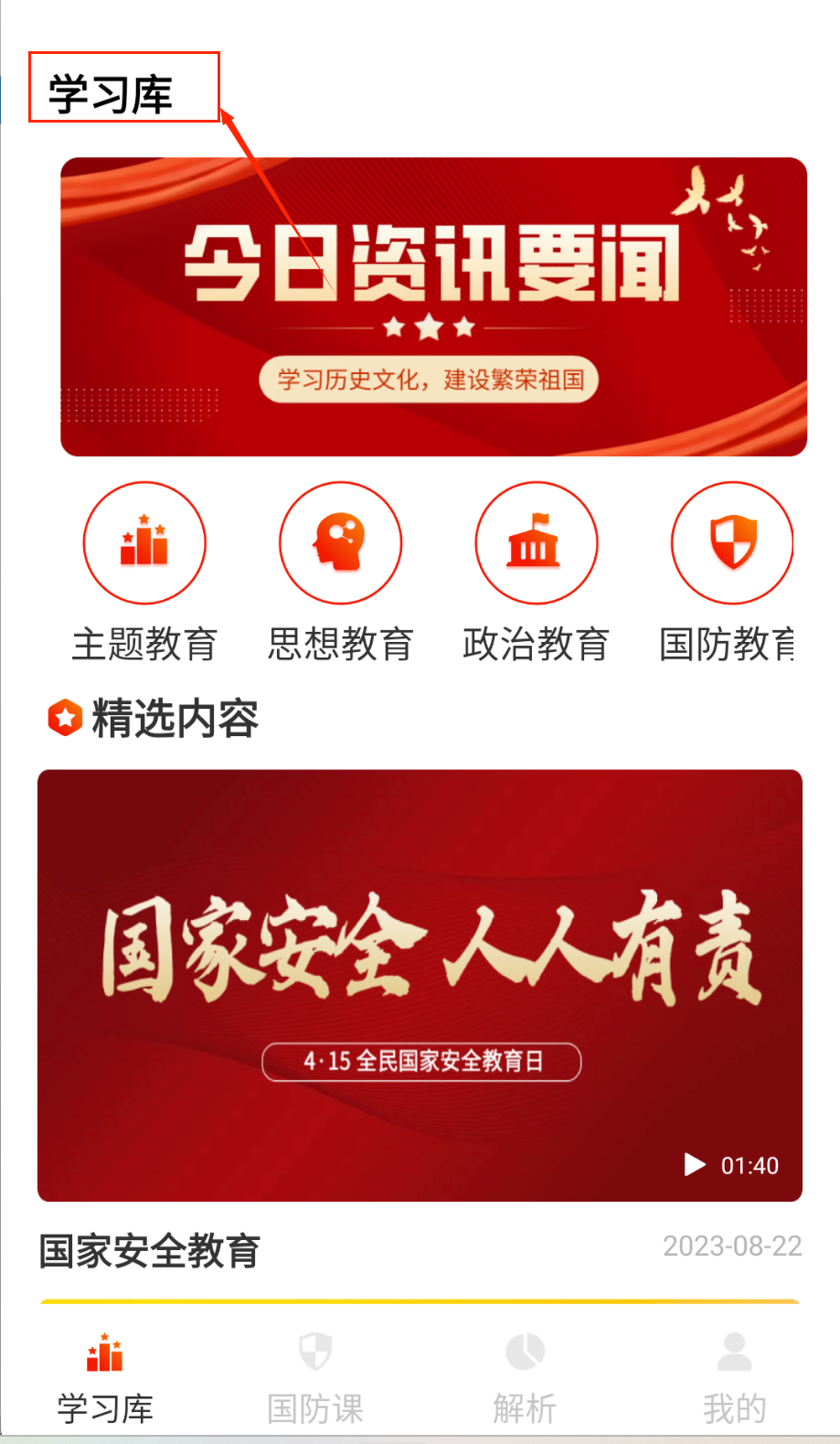2、首页分为理论学习、国防专题、政策解析三大板块,可通过关键词检索或分类标签快速定位目标课程,收藏夹功能支持跨设备同步学习记录。