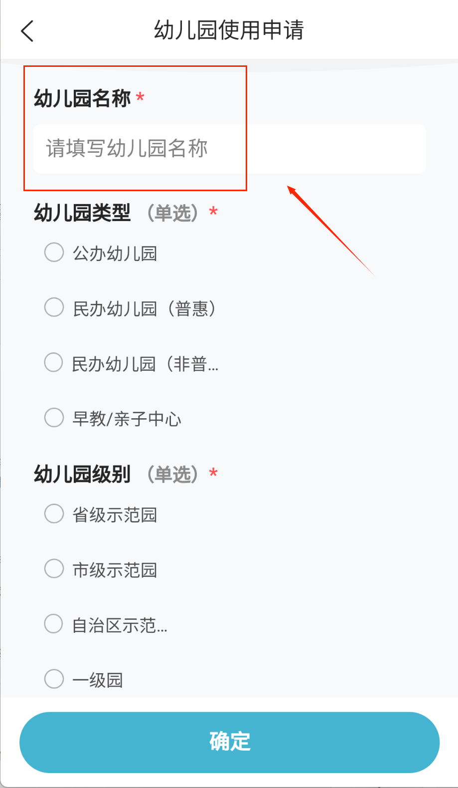 1、首先打开软件进入幼儿园使用申请页面,能看到顶部有明显的申请标题,先找到幼儿园名称栏填写完整的园所名称。