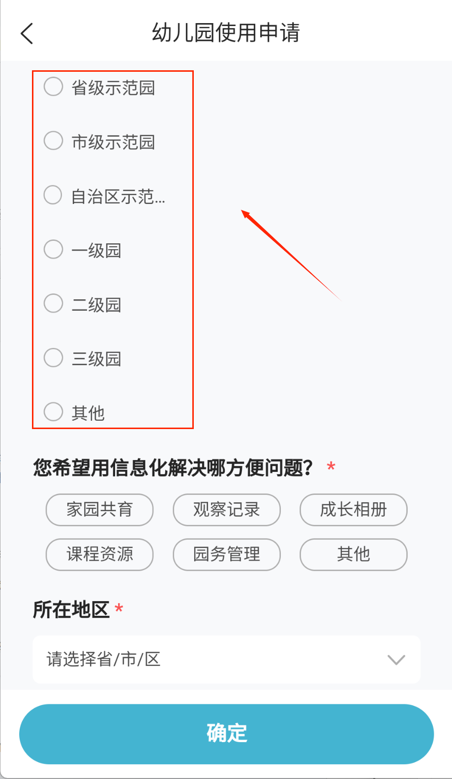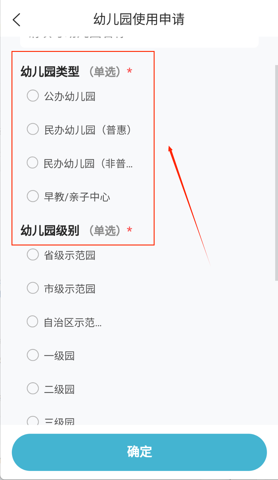 2、接着需要选择幼儿园类型和级别,在单选区域点选对应的选项,比如公办幼儿园或民办幼儿园,级别方面根据实际情况选择选项。