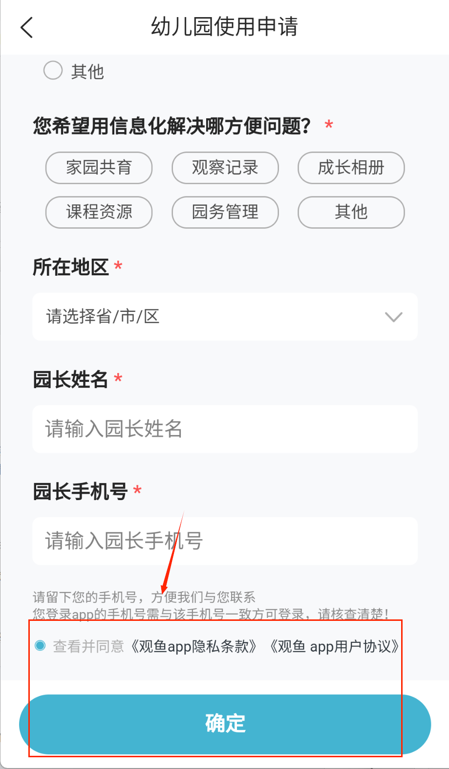 4、最后记得勾选同意隐私条款和用户协议的小方框,检查所有信息都填写正确后,就可以点击下方蓝色的确定按钮提交申请啦。