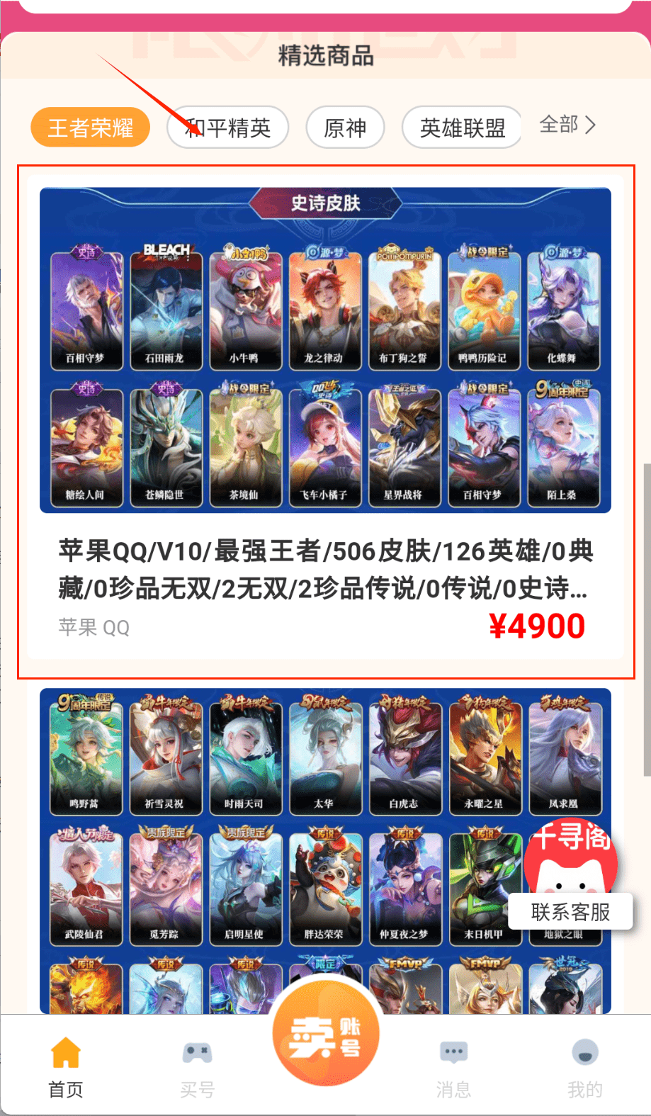 1、注册登录后浏览首页推荐账号或通过搜索框查找特定游戏账号,筛选条件包括段位、皮肤数量等关键指标。