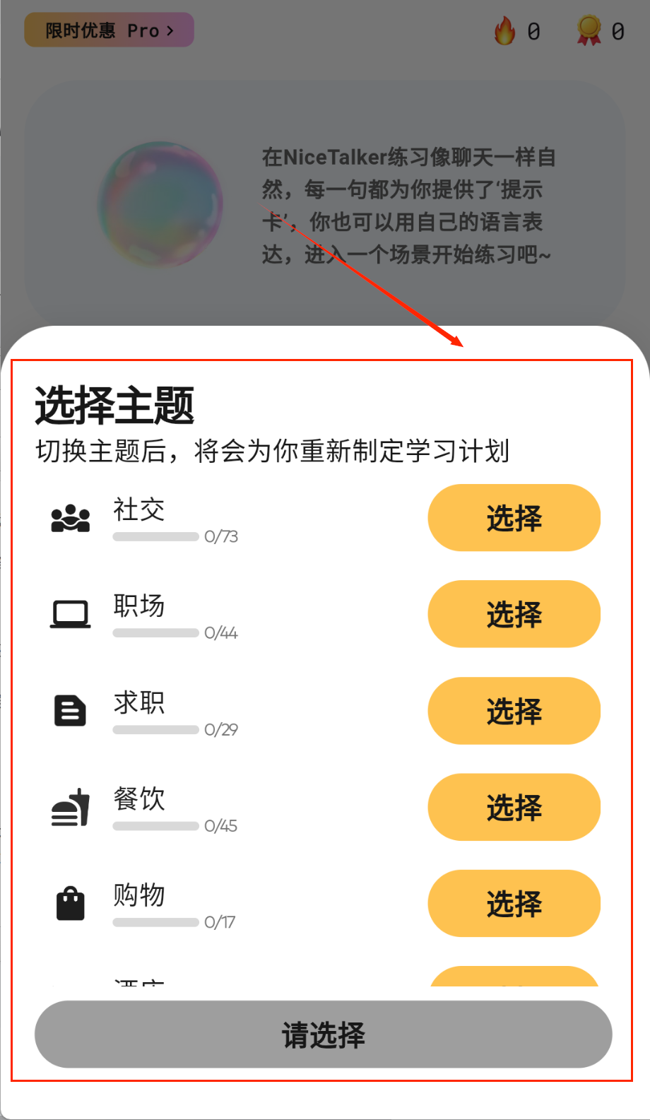 1、完成手机号或邮箱注册后进入应用主界面,用户可根据自身英语水平和学习目标选择适合的练习场景,包括多样化主题内容模块。