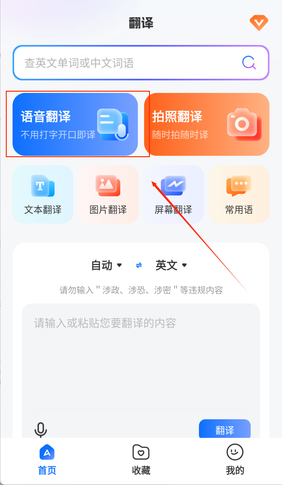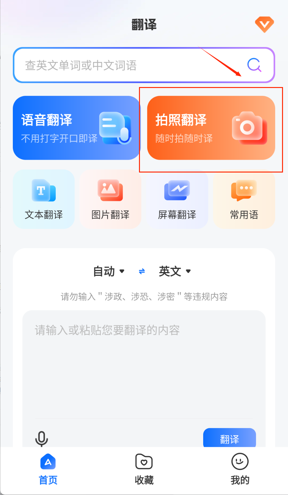 1、完成手机号或邮箱注册登录后进入应用主界面,用户可根据实际需求选择语音即时翻译、拍照图像识别翻译或文本输入翻译等多种翻译模式。