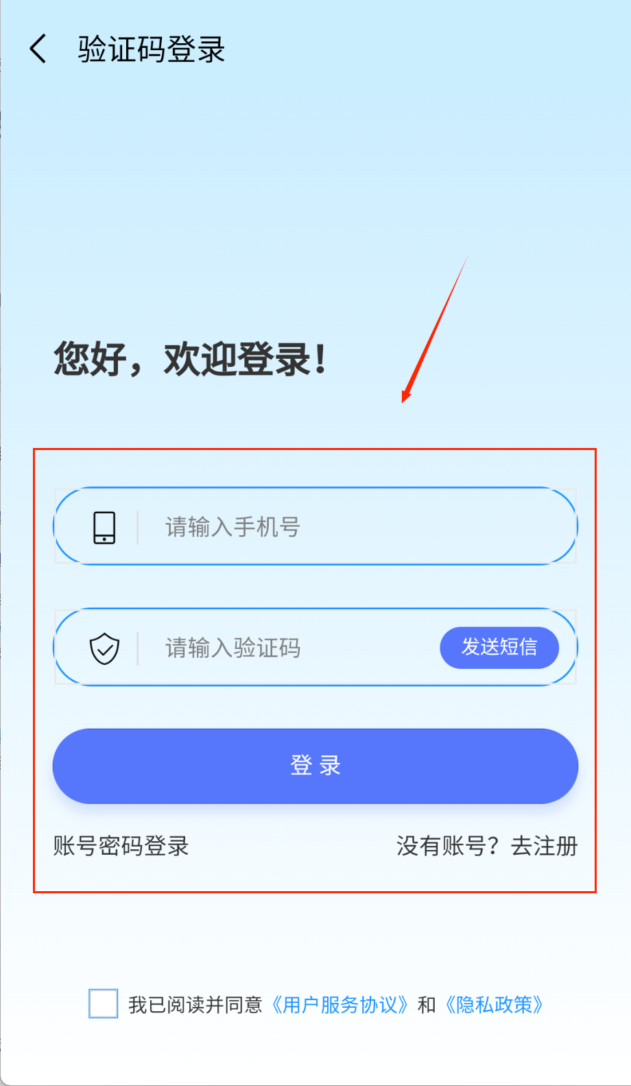 1、打开软件后会看到清新的登录界面,若选择验证码登录,就在顶部提示处输入您的手机号,点击发送短信按钮获取验证码。