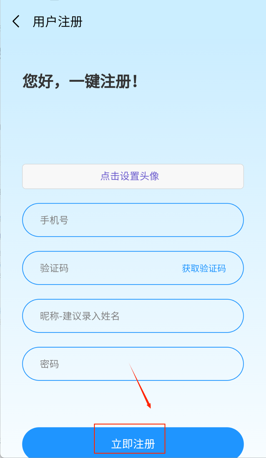 4、新用户需要先完成注册才能使用,在注册界面按要求设置头像、填写手机号并获取验证码,再设置好昵称和密码,点击立即注册就可以完成。