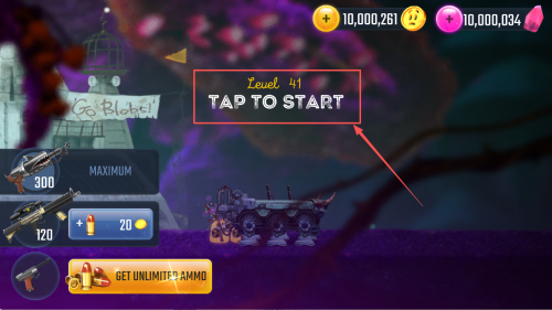 3、如何开始关卡?看到“TAP TO START”时轻点屏幕,再点“GET UNLIMITED AMMO”领取无限弹药即可开战。