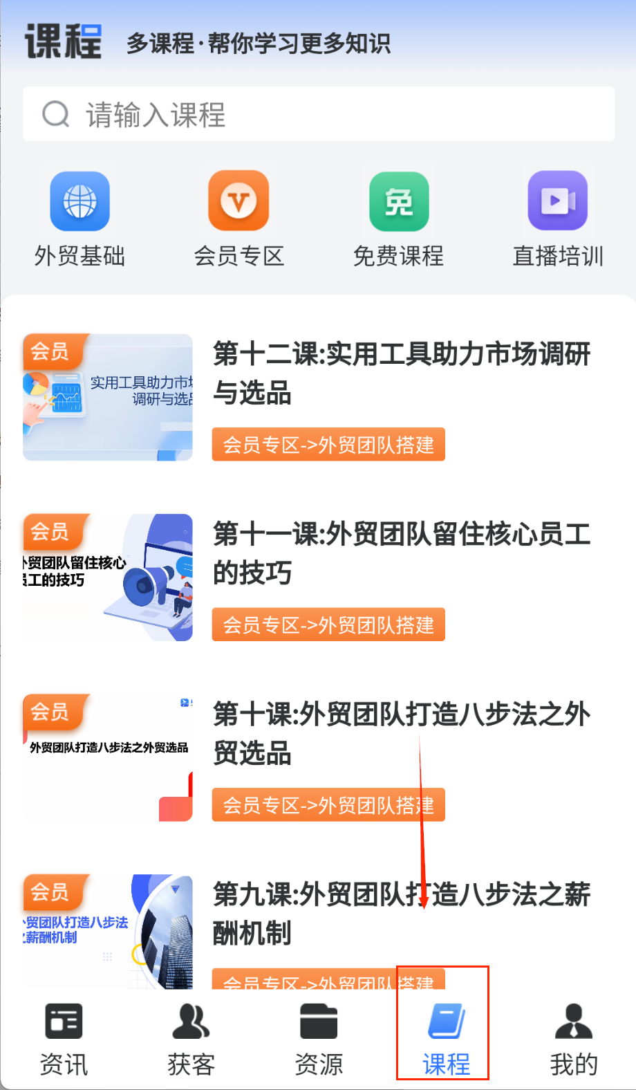 3、课程中心提供专业的出海实战课程系统学习,用户可以根据自身需求选择直播培训或录播课程,提升海外市场拓展的实战能力。