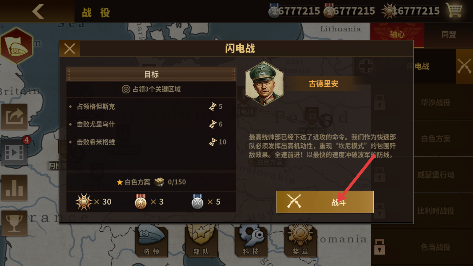 1、进入【闪电战】战役,明确目标是占领3个关键区域,点击金色【战斗】按钮,跟随古德里安的指挥开启战斗。