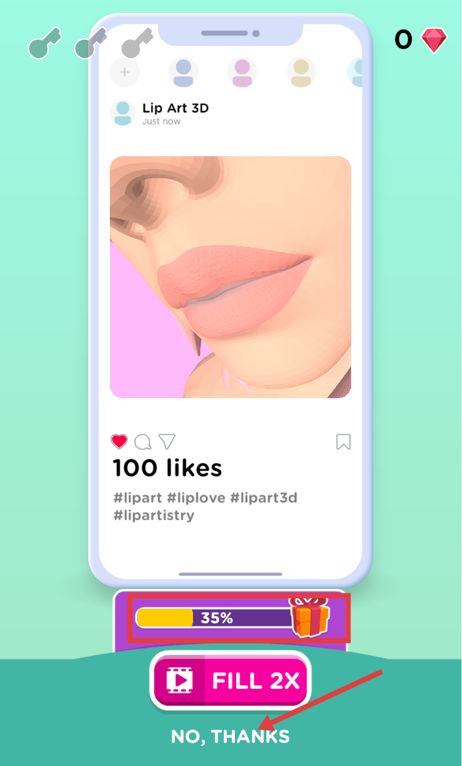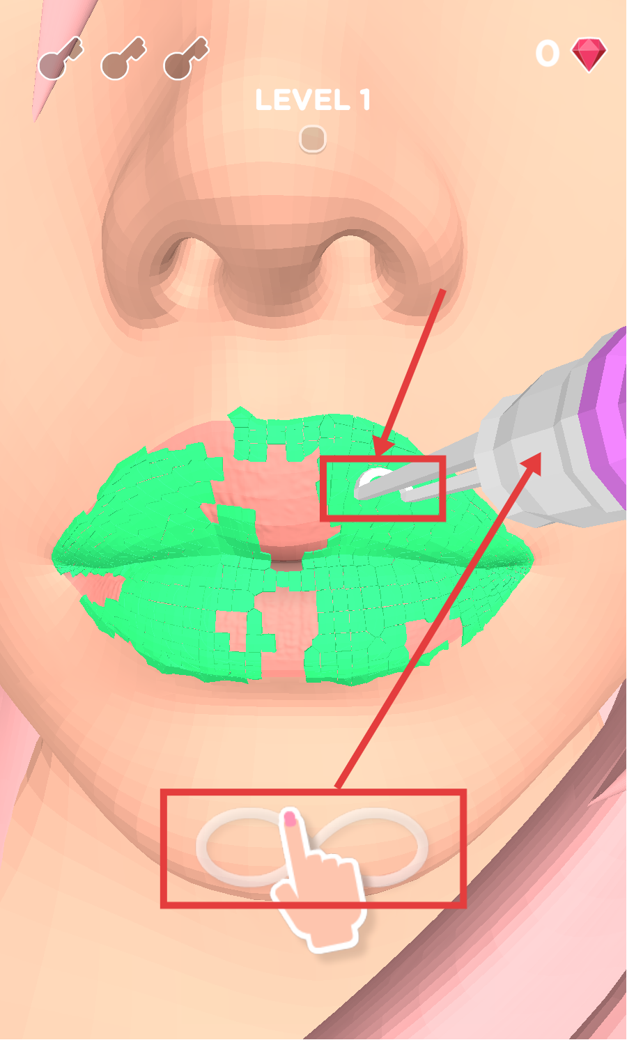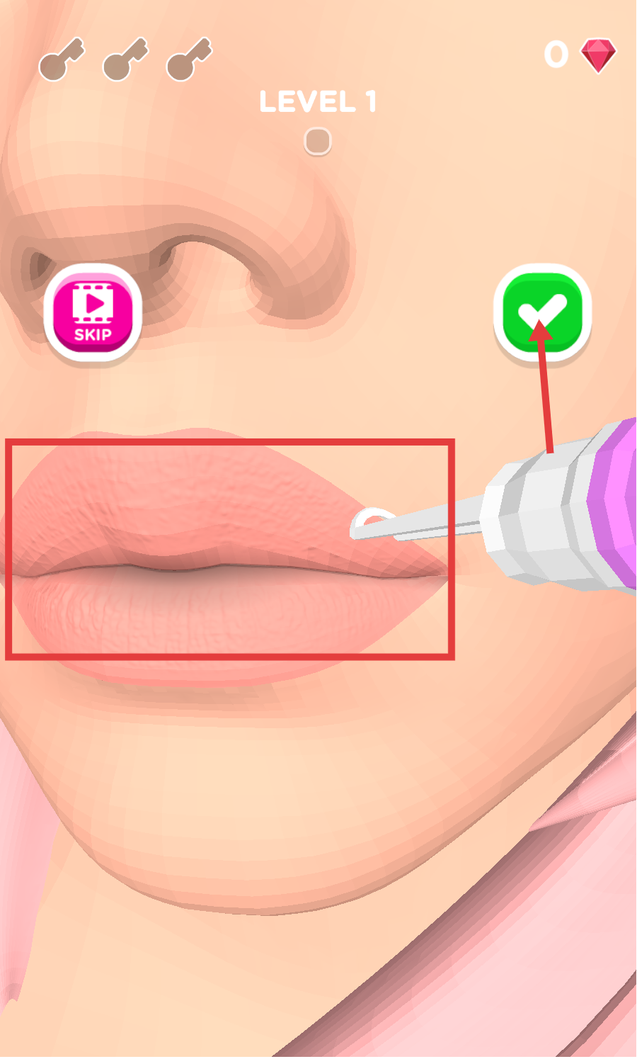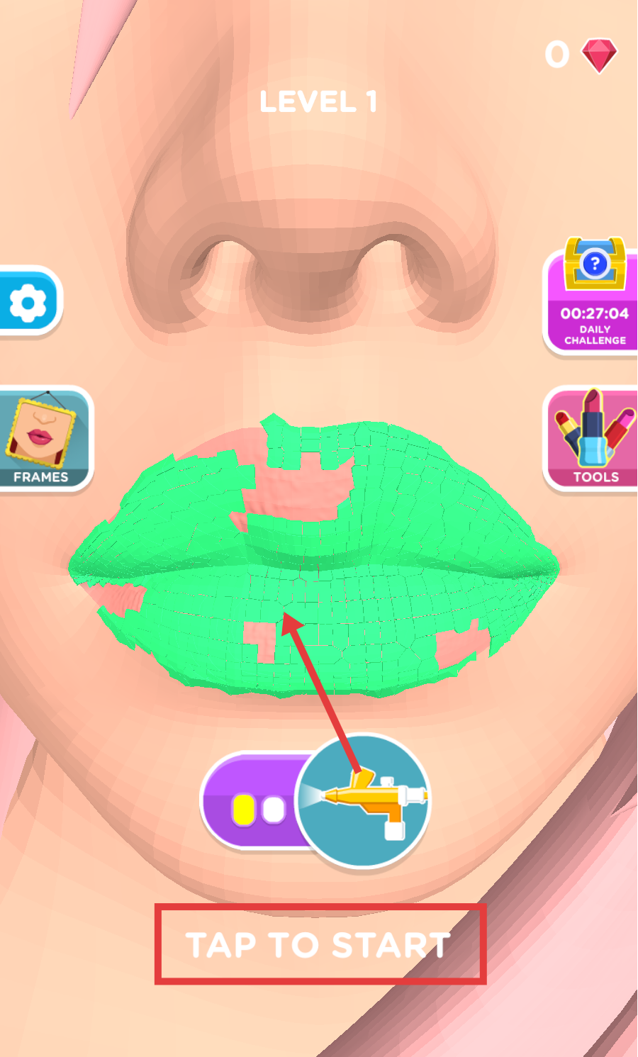 1、打开【Lip-Art-3D】游戏,选择【LEVEL-1】,点击启动按钮进入唇部创作界面,先熟悉界面布局再开始操作。