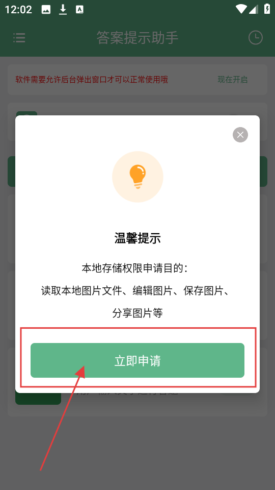 2、若用图片答题,会弹出本地存储权限申请提示,点【立即申请】,获取权限以便读取图片。