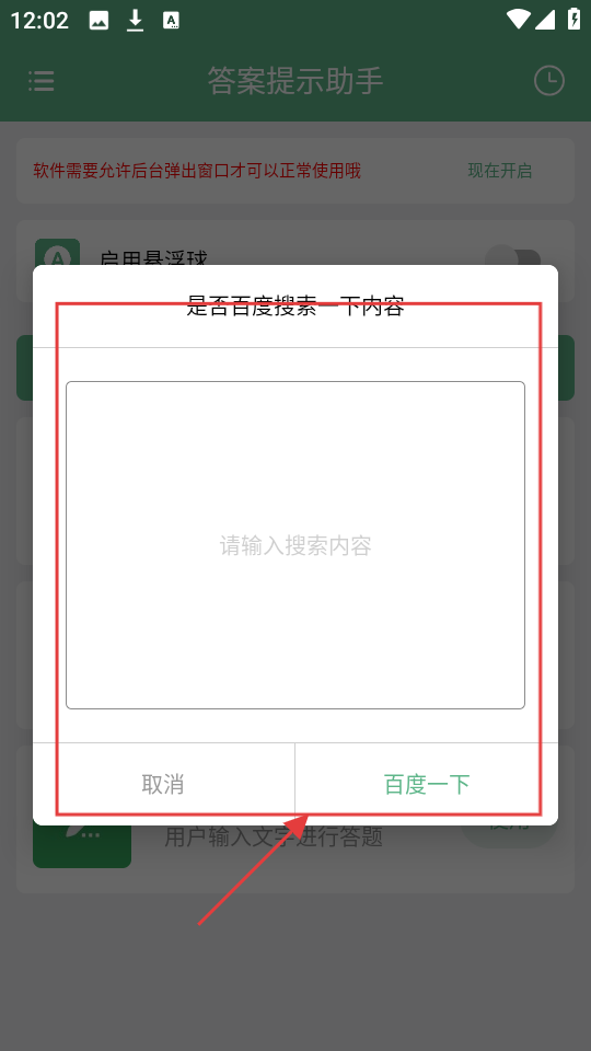 4、若需搜索内容,在弹窗输入框填写后,点【百度一下】,通过百度搜索获取答题相关信息。