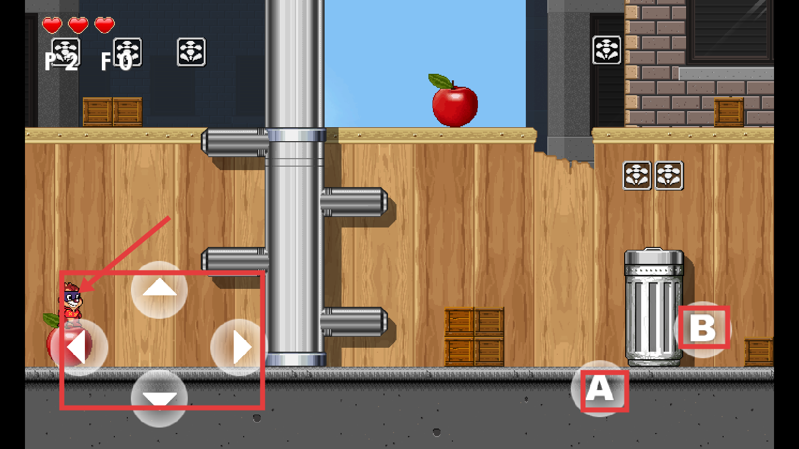 2、在场景中利用方向键控制移动,遇到道具如苹果时,可通过【A】【B】键互动获取。