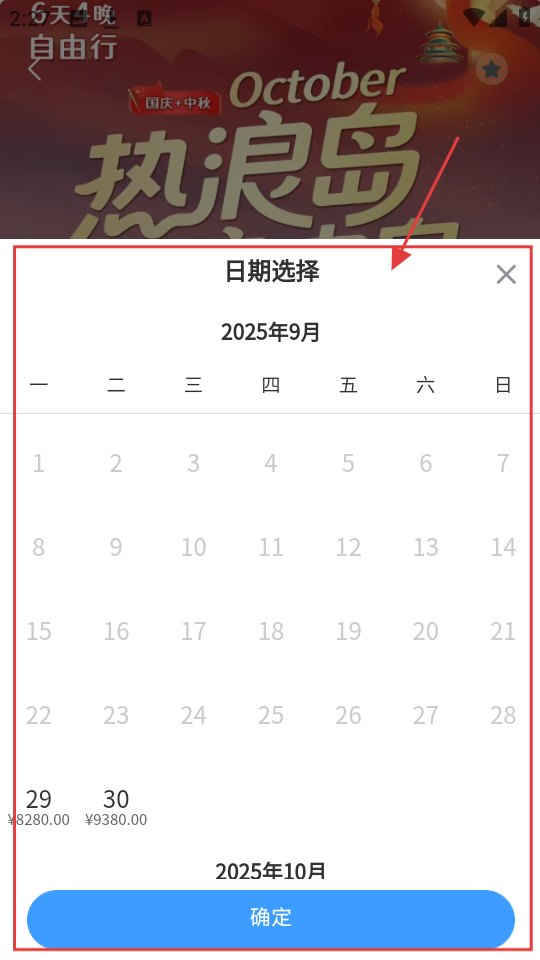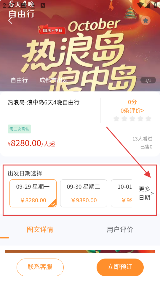 3、进入自由行产品详情页,如热浪岛-浪中岛,可看价格,选出发日期,也能点【更多日期】。