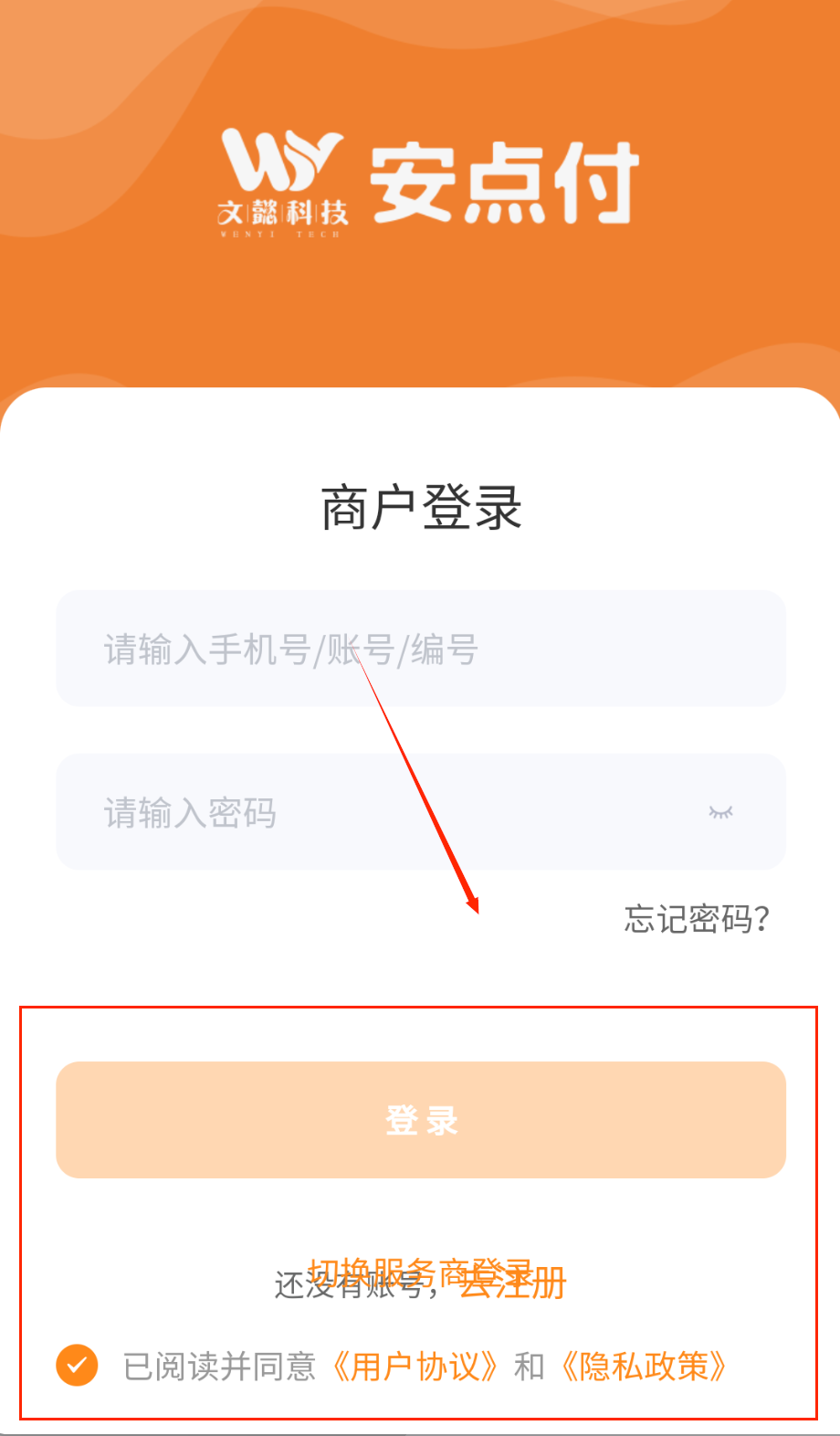 1、打开软件首先看到橙白配色的登录界面,在顶部文懿科技安点付标识下方找到服务商登录选项,输入手机号或账号编号和对应密码。