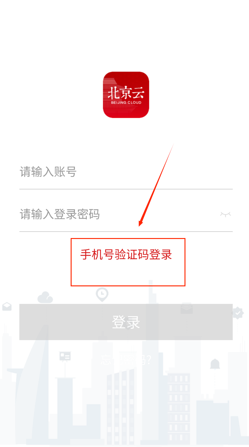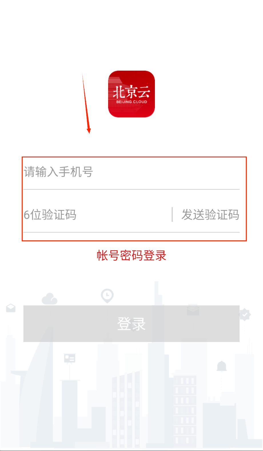 1、打开软件看到简洁的登录界面,上方显示当前时间和信号状态,中间醒目的红色北京云标志下方有两个输入框。