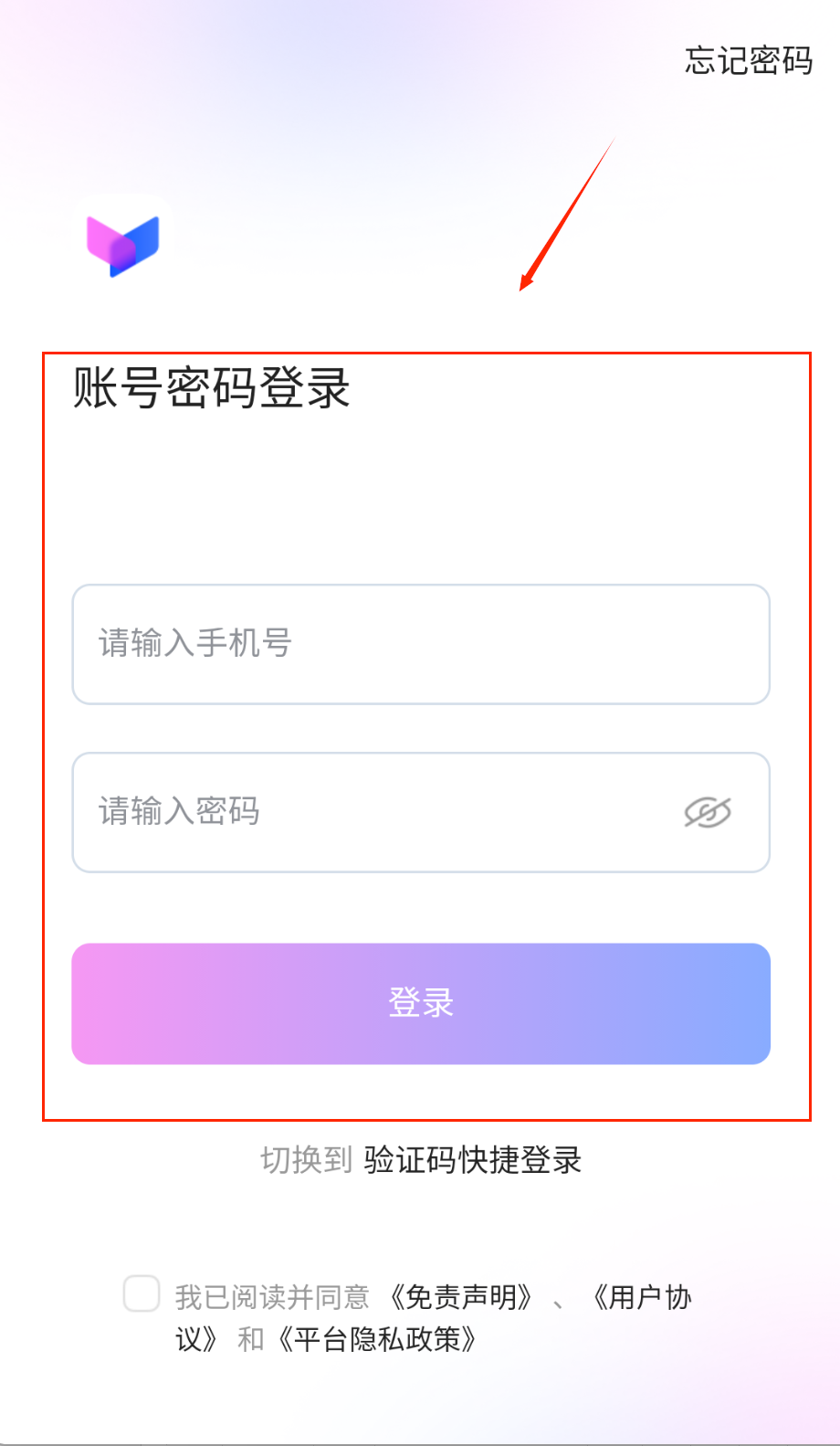 1、 想要快速登录软件,首先打开应用进入登录界面,在账号密码登录选项下的输入框中填写您的手机号码和密码,记得勾选同意相关协议政策。