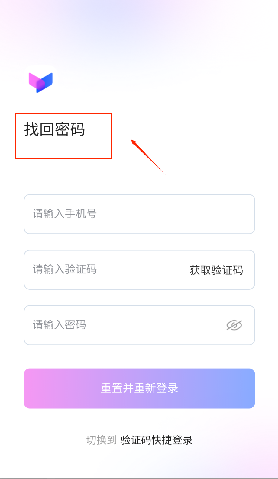 3、 万一不小心忘记了密码也别着急,您可以在登录页找到找回密码选项点击进入,根据提示输入注册时使用的手机号码并获取验证码。