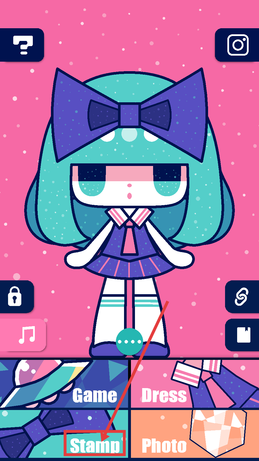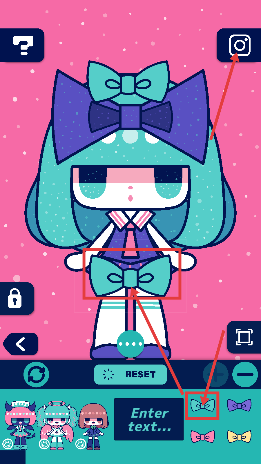 3、在装饰界面,可选择下方如蝴蝶结类的装饰来装扮角色,还能点击右上角【Instagram】图标,为后续分享做准备。