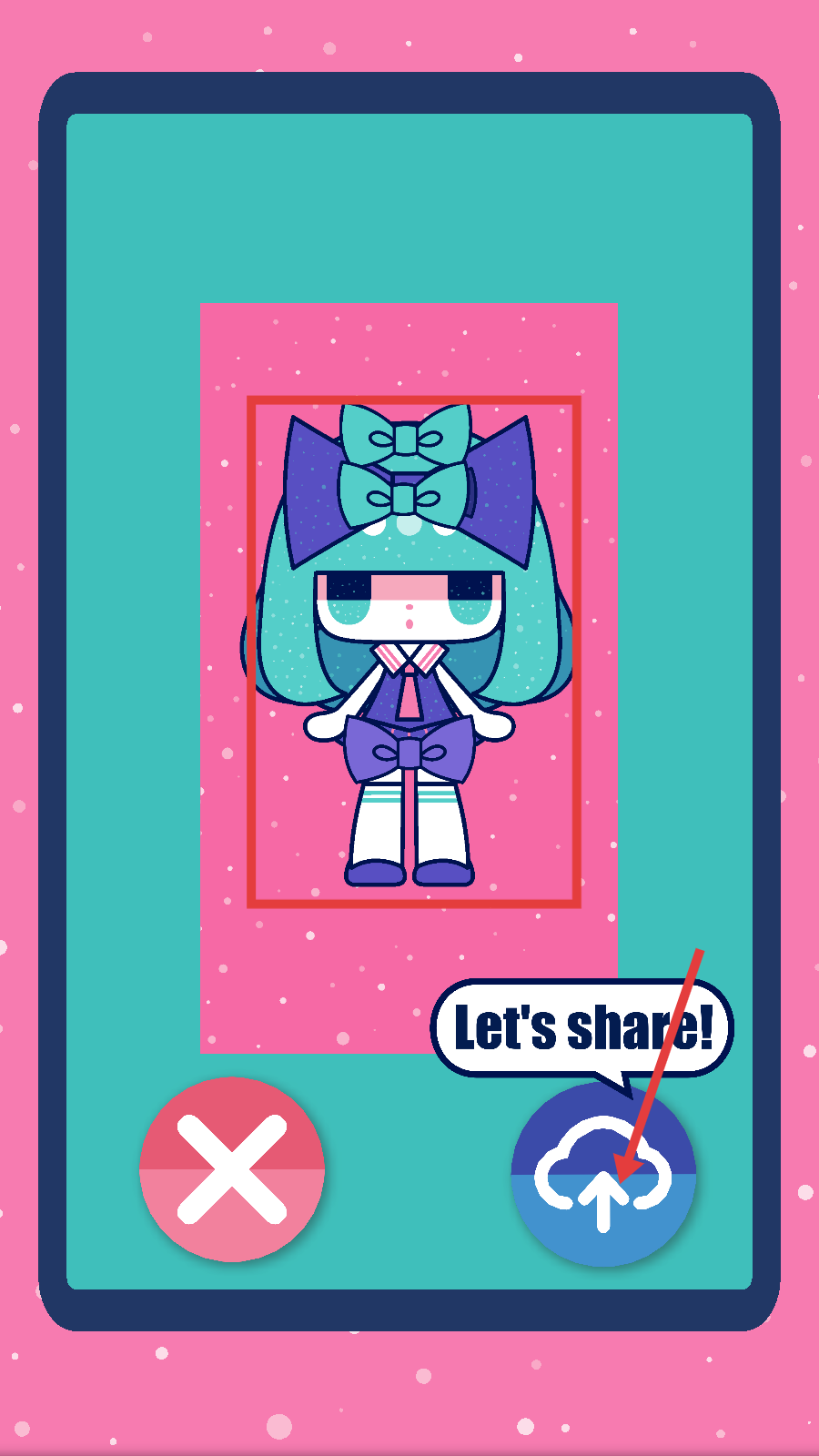 4、当角色装扮完成后,点击带有【Let's-share!】提示的分享图标,就能将装扮好的角色分享出去。