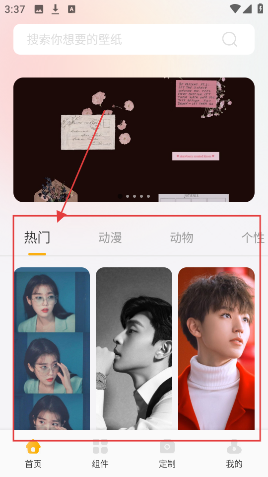 1、进入壁纸首页,可搜索壁纸,也能从【热门】【动漫】等分类选,找喜欢的壁纸。