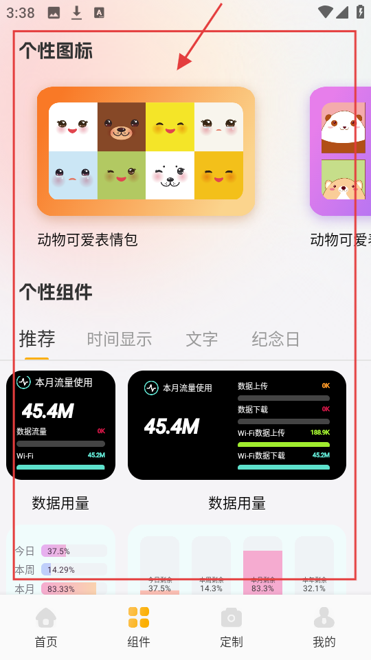 3、切换到组件页,可看【个性图标】【个性组件】等板块,选动物可爱表情包等图标。