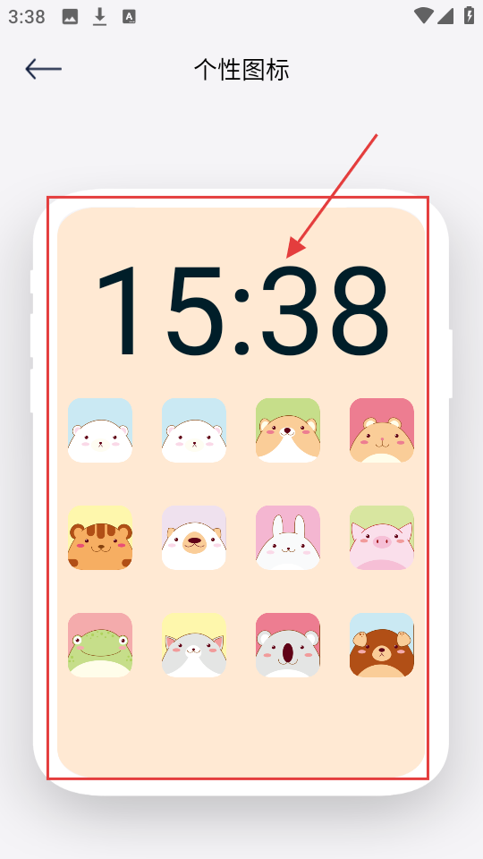 4、进入个性图标页,可看带可爱动物图标和时间显示的界面,挑选喜欢的个性图标样式。