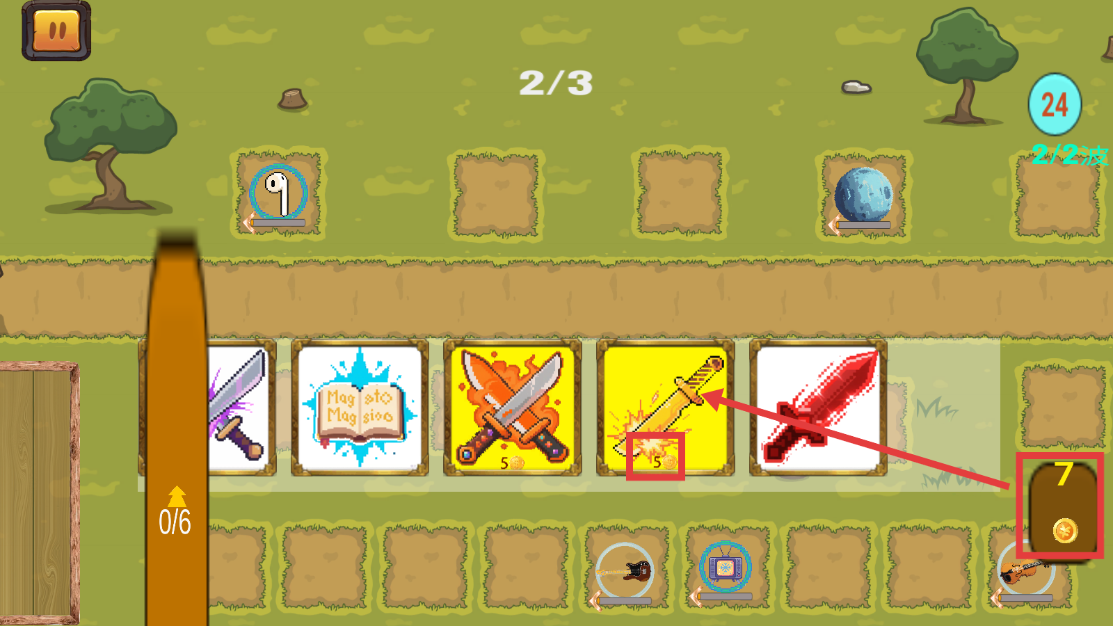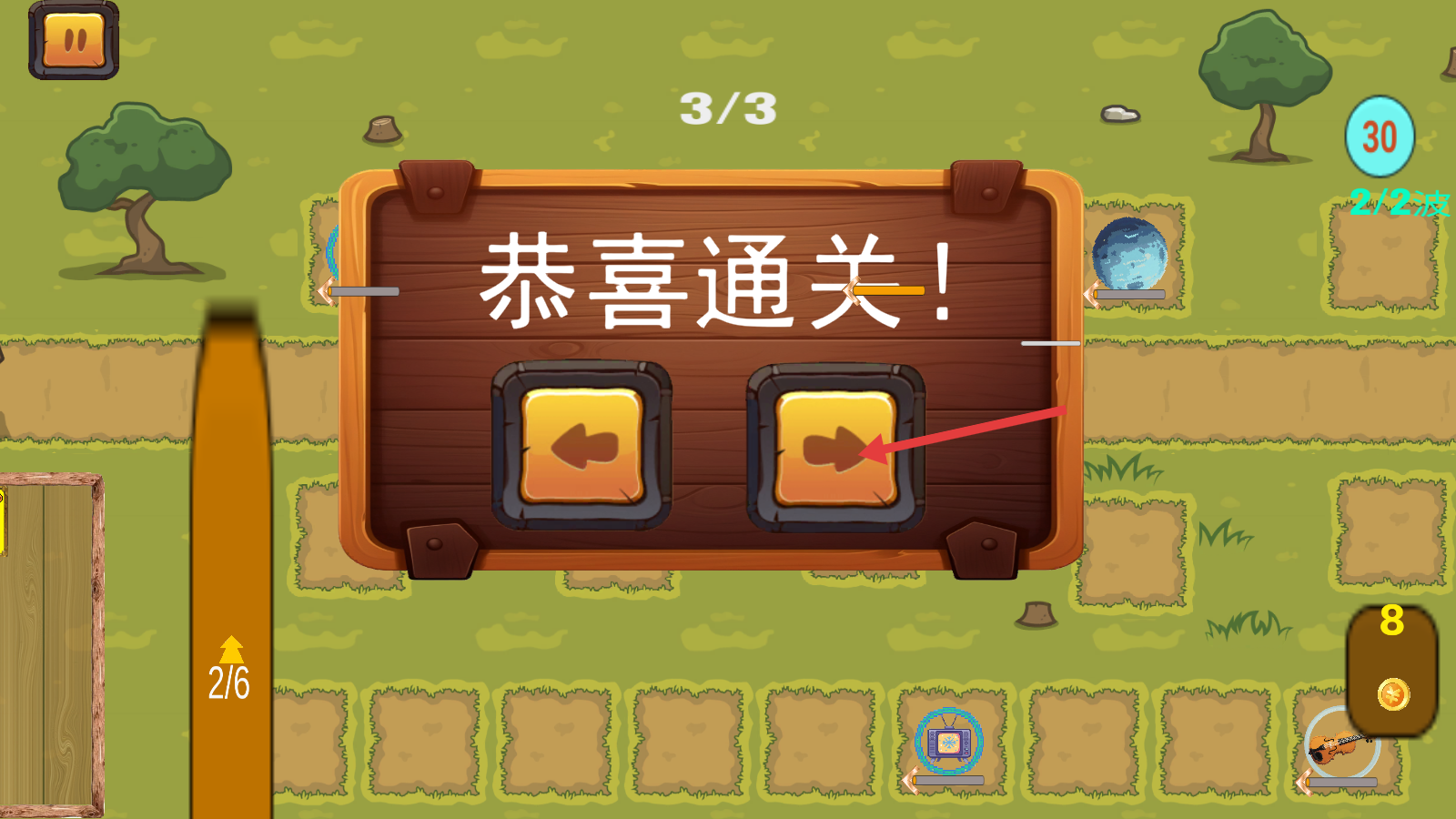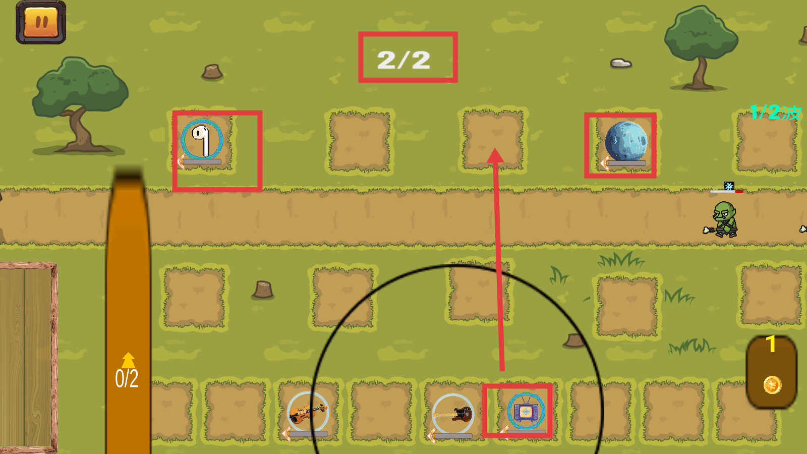 2、在关卡内,根据指引放置不同功能的道具,留意上方“2/2”等进度提示,应对敌人的“1/2波”进攻。