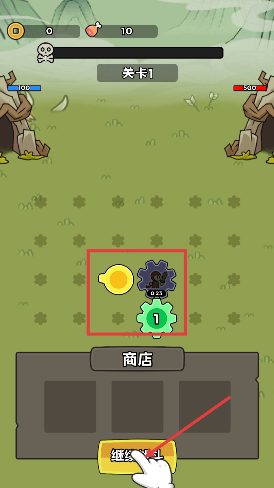 2、完成道具准备后,点击【继续战斗】按钮,即可进入关卡1的对战场景,开启战斗。