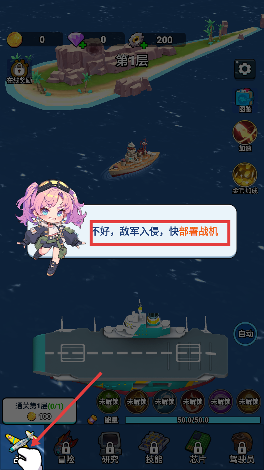 1、敌军入侵时,点击界面左下角【战机】按钮,准备部署战机,应对敌方进攻。