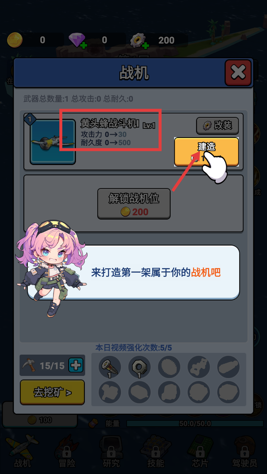 2、进入战机界面后,找到【黄头蜂战斗机】,点击其右侧的【建造】按钮,打造第一架战机。