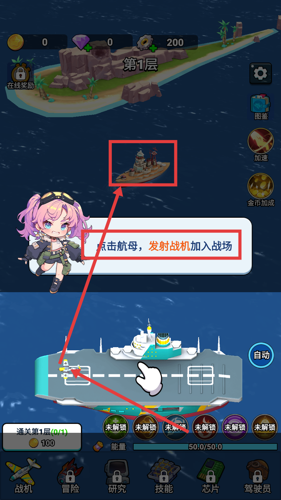 3、战机建造完成后,点击航母,发射战机加入战场,让战机对敌方舰船发起攻击。