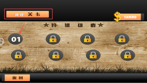 3、如何挑选关卡?点“送择关卡”,选“★特猎雄鹿★”,消耗5000金币后返回。