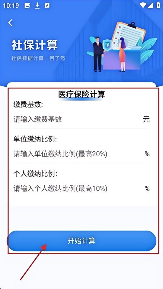 2、进入医疗保险计算页,输入缴费基数、单位和个人缴纳比例,点【开始计算】,得出结果。