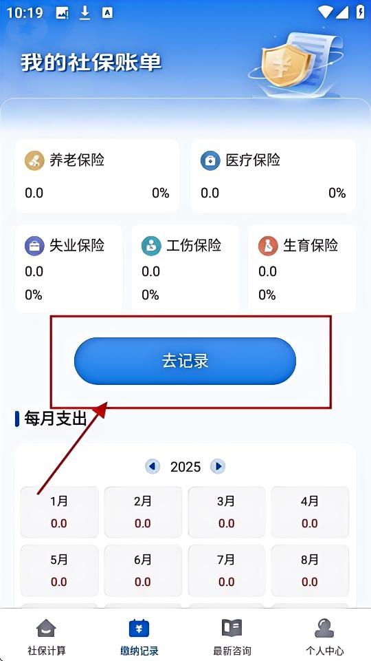 3、进入我的社保账单页,可看各险种缴纳情况,点【去记录】,记录社保支出。