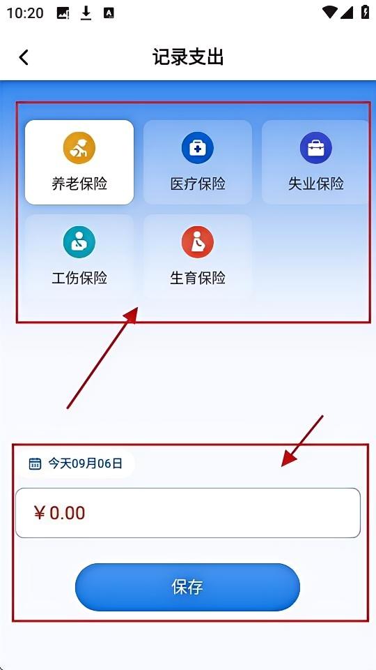 4、进入记录支出页,选养老保险等险种,输入支出金额,点【保存】,完成支出记录。