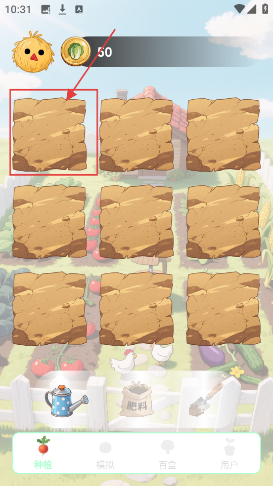 1、进入种植页,可看多块土地,选一块土地,准备种植作物。