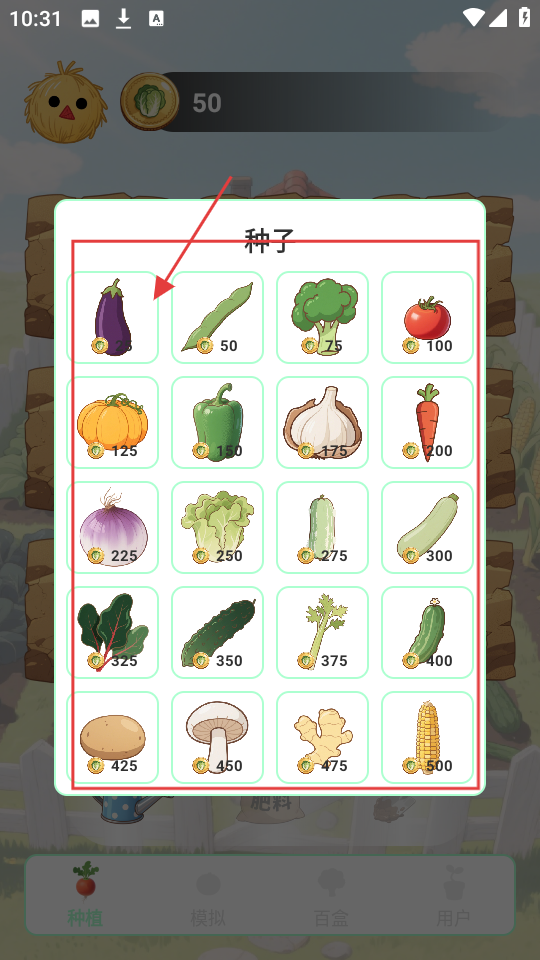 2、选好土地后,进入种子选择页,有茄子、豆角等多种种子,选心仪种子,消耗对应金币种植。