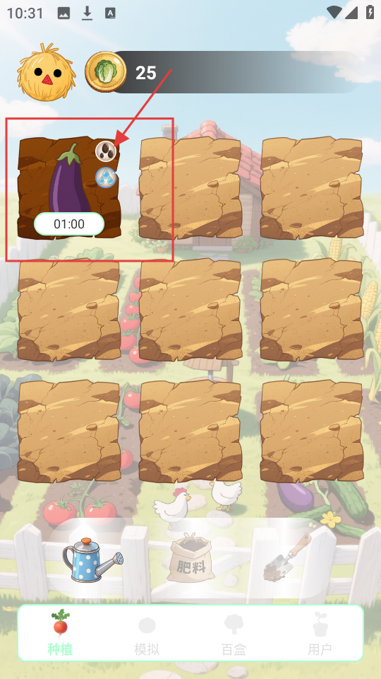 3、种下种子后,土地上会显示作物生长状态,需等待一定时间,期间可施肥、浇水,促进生长。