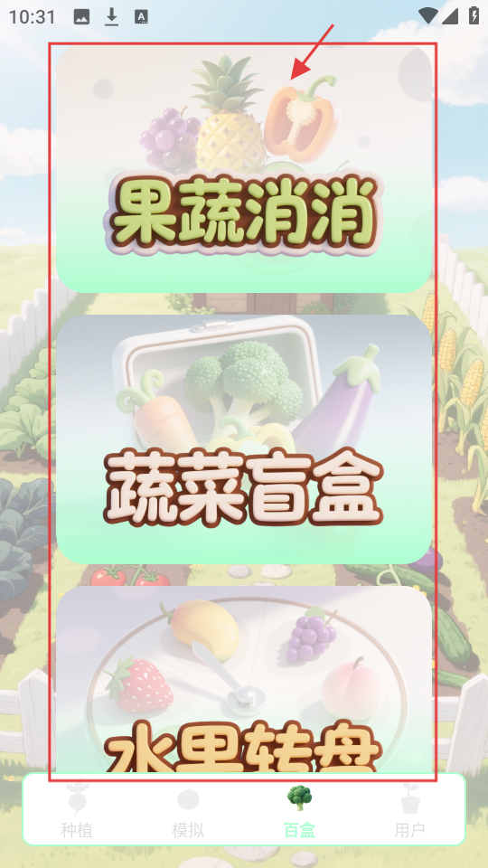 4、切换到百盒页,可玩【果蔬消消】【蔬菜盲盒】等游戏,参与游戏获取奖励,助力种植。