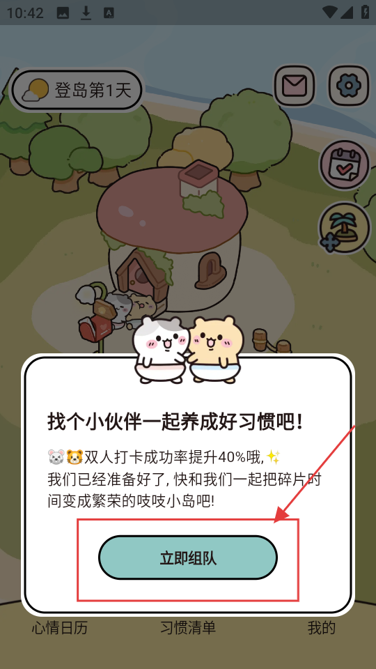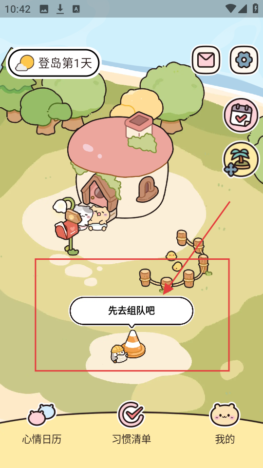 1、登岛第1天,看到“先去组队吧”提示,可组队开启小岛养成,和伙伴一起把碎片时间变繁荣小岛。