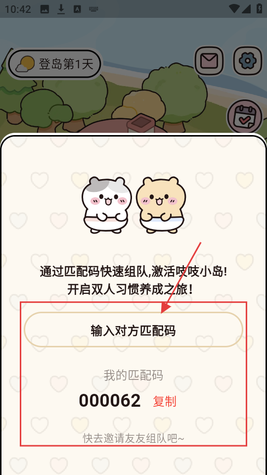 3、进入组队页,可输入对方匹配码,也能查看自己的匹配码【000062】,邀请友友组队,激活小岛。