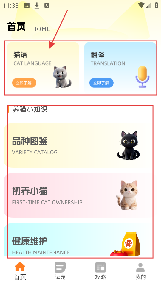 1、进入首页,可看【猫语】【翻译】功能,还有养猫小知识板块,选感兴趣内容,了解养猫相关。